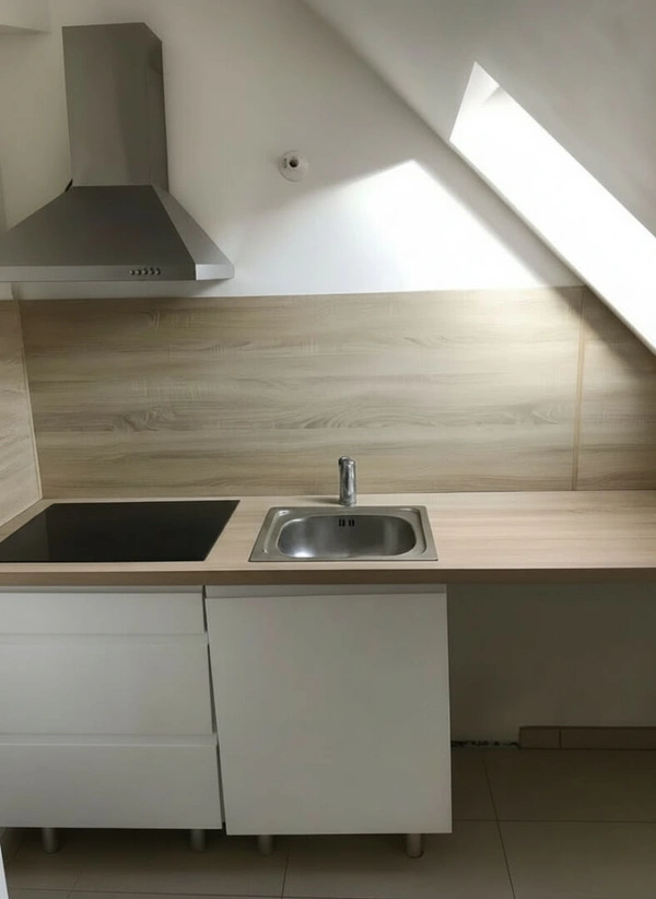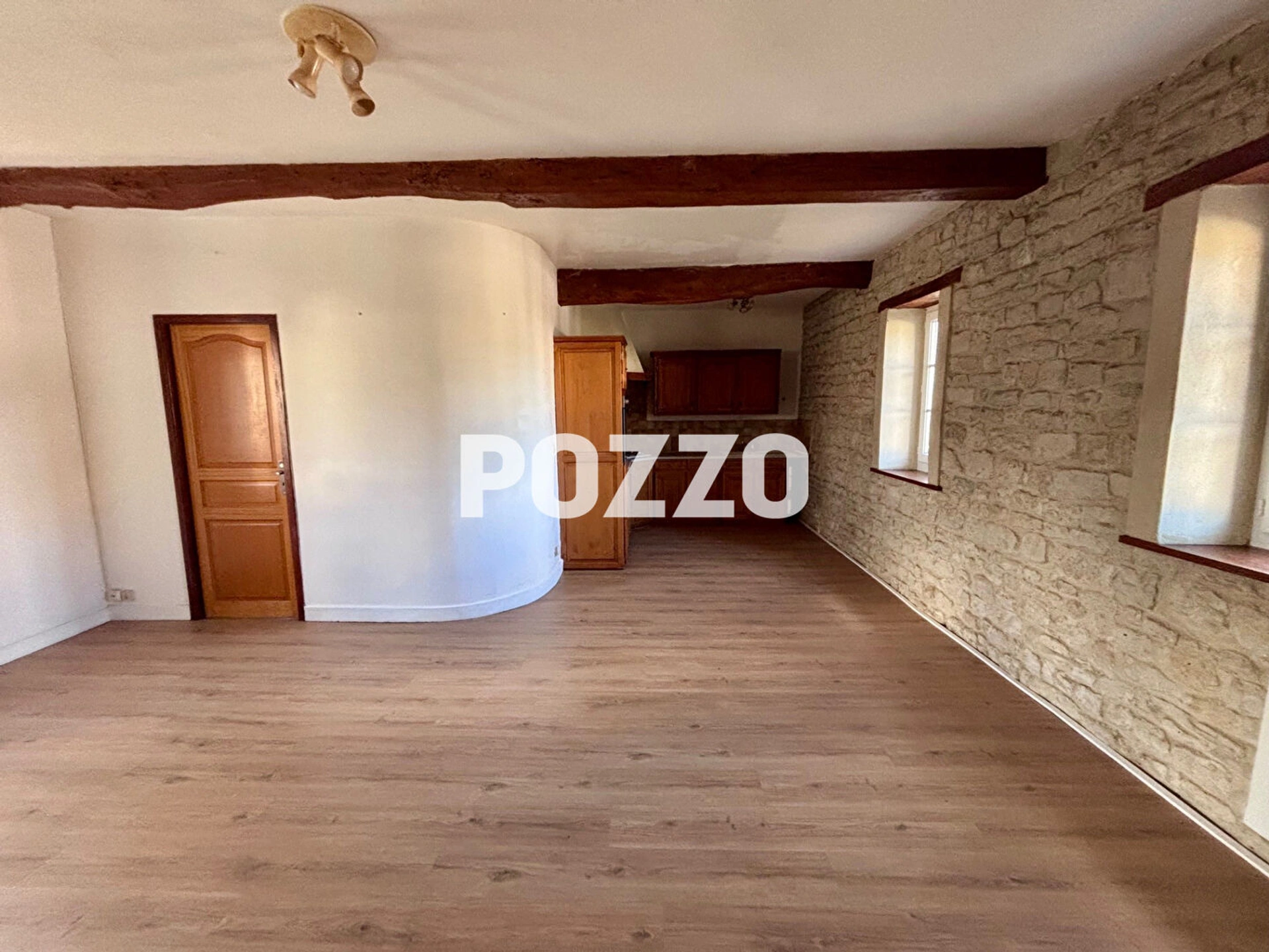 1er étage : agréable séjour avec cuisine ouverte aménagée et équipée (four, plaque de cuisson au gaz, hotte), ainsi qu'une chambre ;