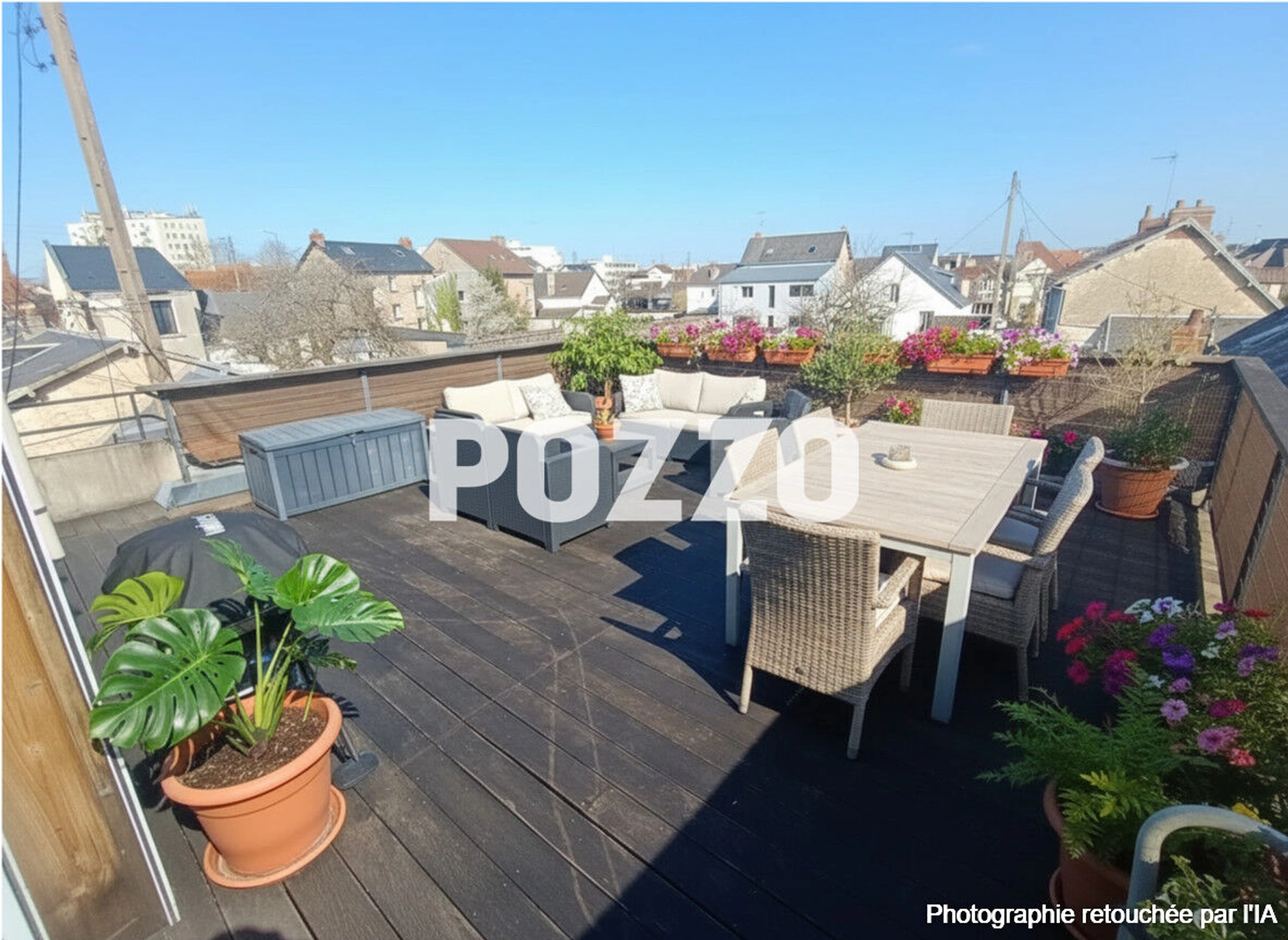 A l'extérieur, vous profiterez d'une terrasse sans vis-à-vis de 32,5m2, véritable prolongement du séjour, idéale pour recevoir ou se détendre en toute tranquillité.