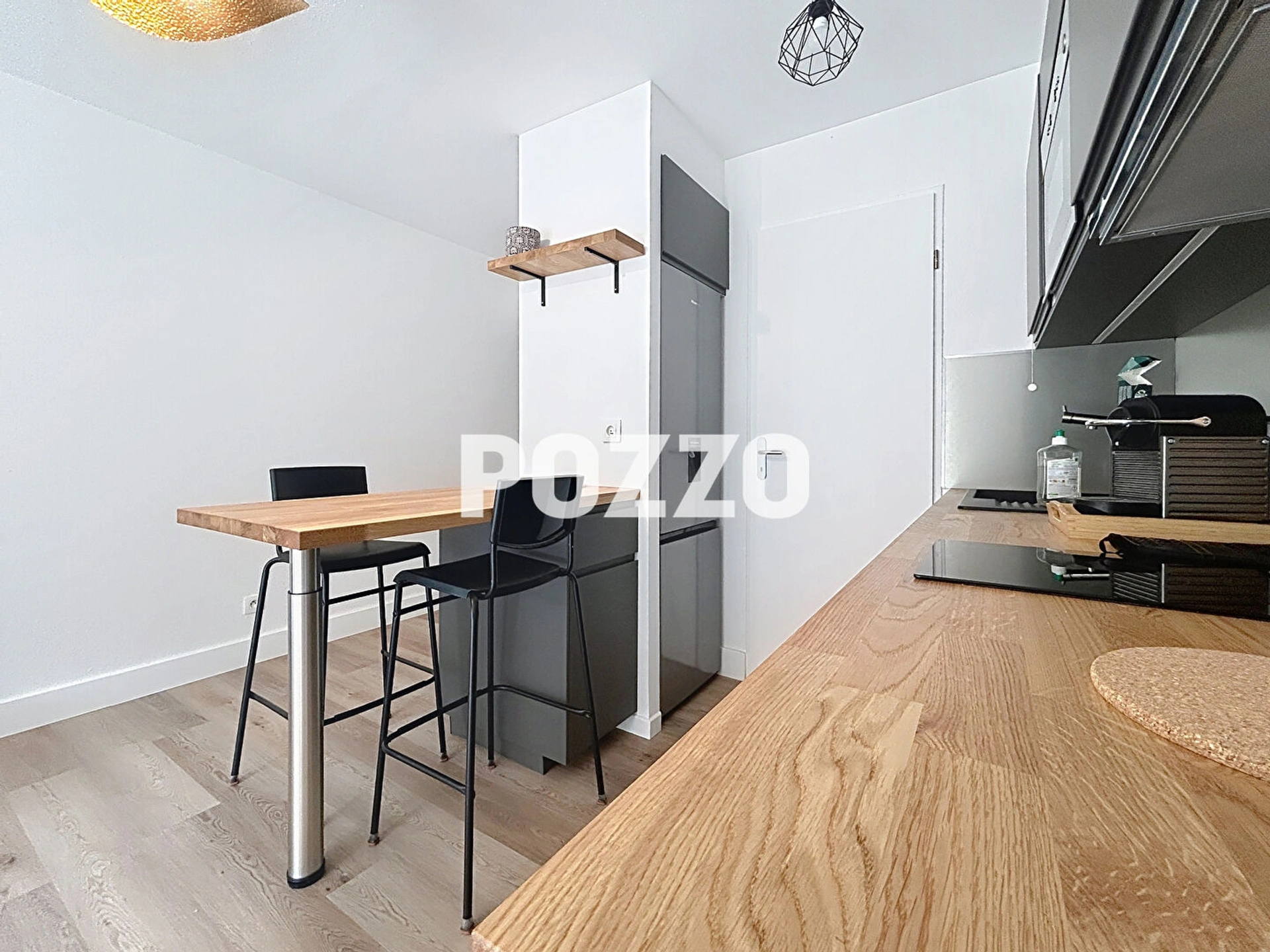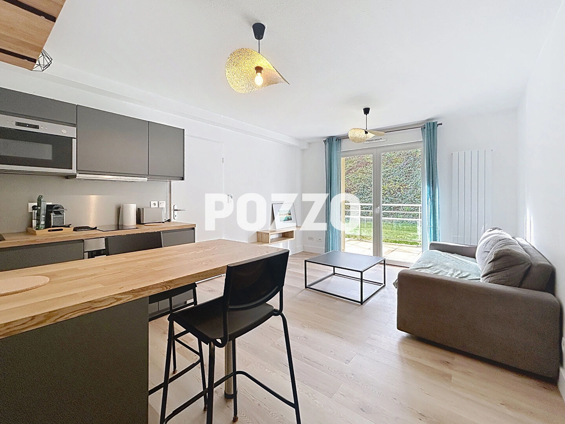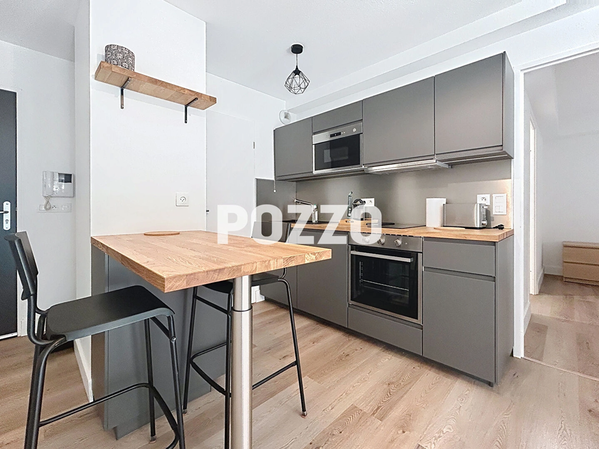Une belle pièce de vie avec une entrée, une belle cuisine aménagée et équipée ouverte sur un séjour-salon, une chambre avec placard et une salle d'eau avec WC. Belles prestations.