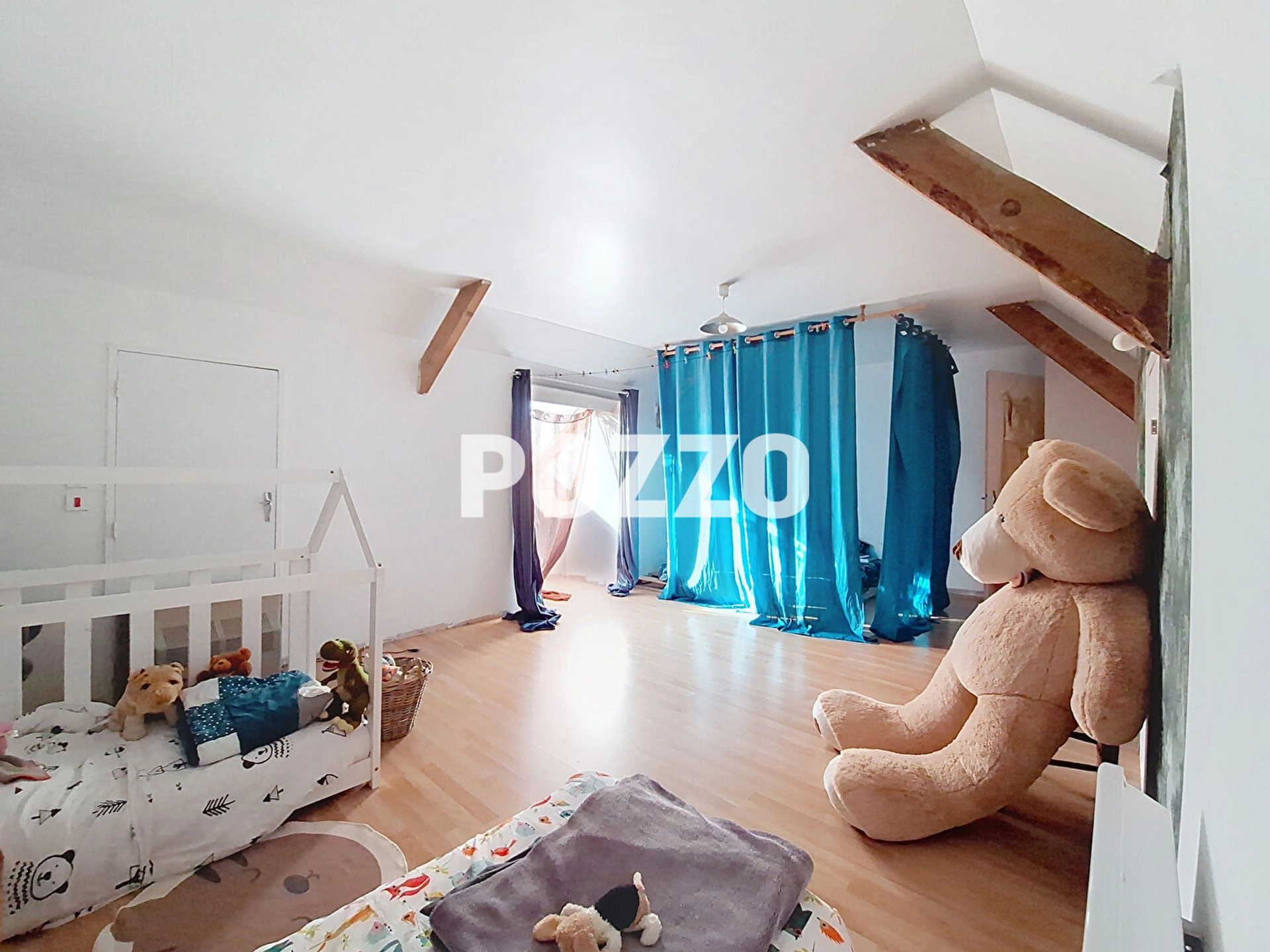 A l'étage, une vaste chambre vous attend, accompagnée de deux greniers aménageables, offrant un potentiel supplémentaire pour personnaliser cet espace selon vos envies.