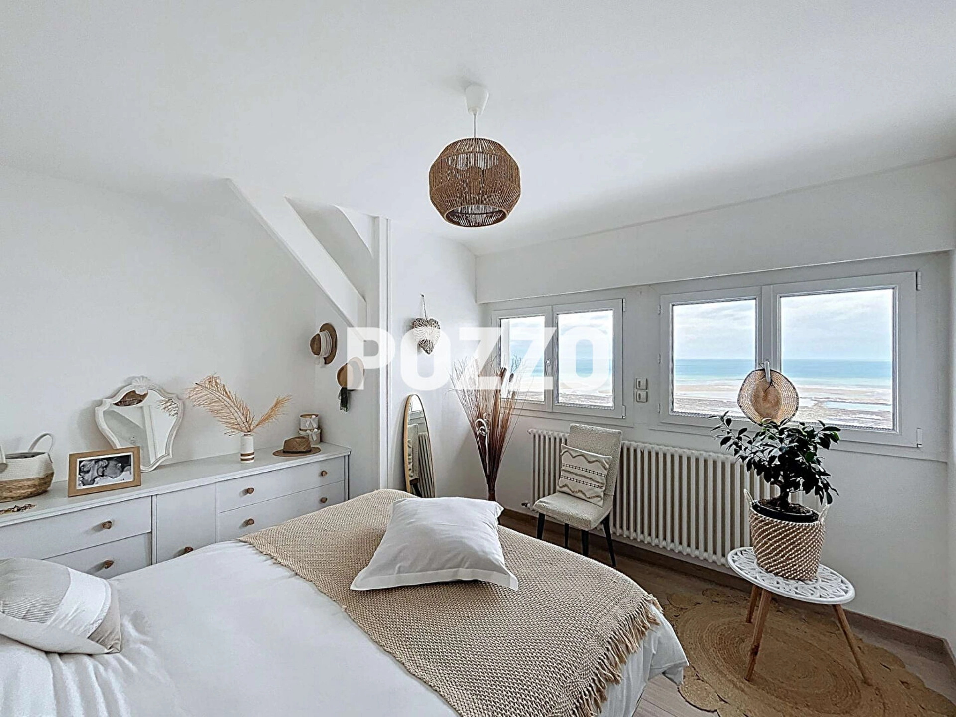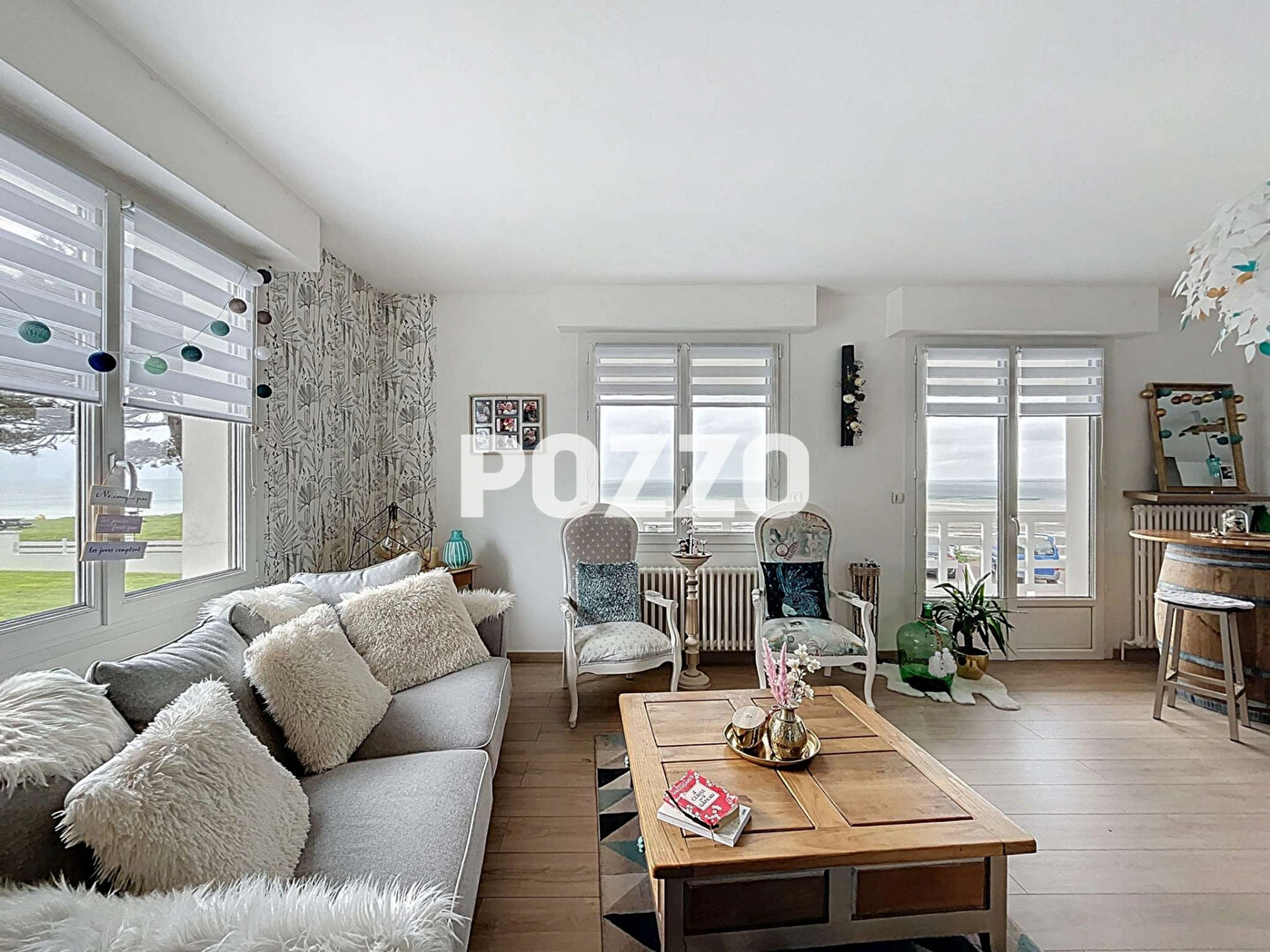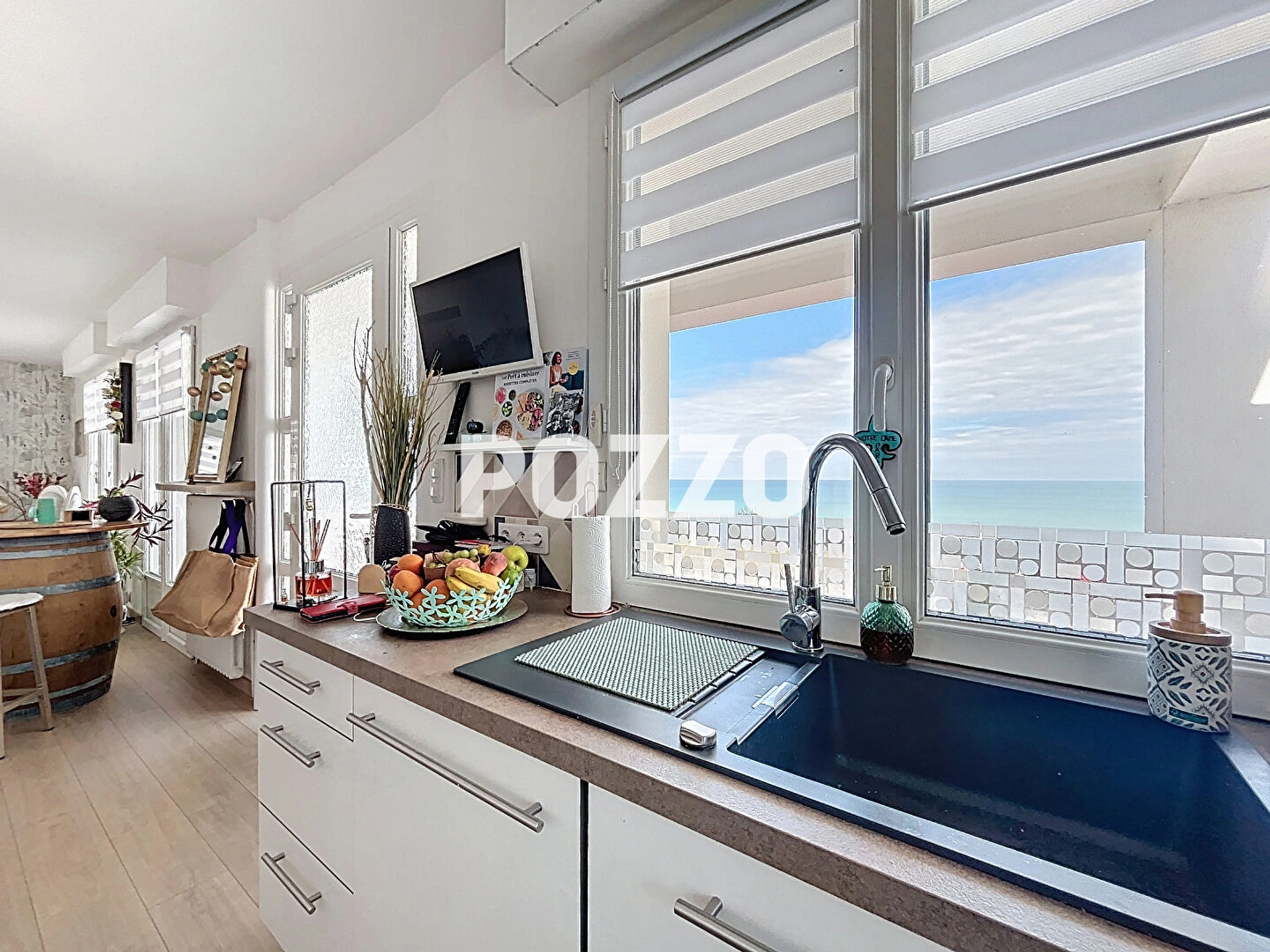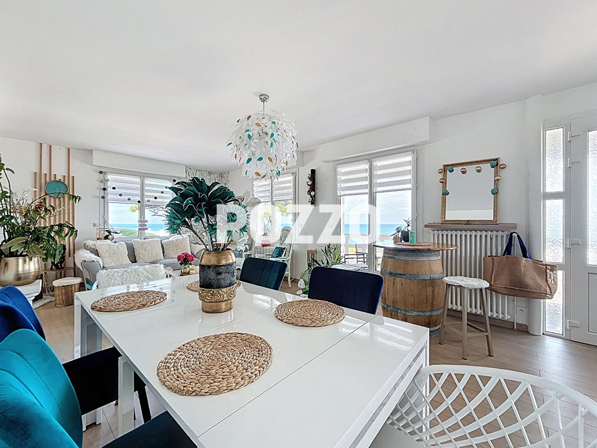 Les espaces de vie se composent d'une spacieuse pièce à vivre avec cuisine ouverte, un salon lumineux offrant une vue imprenable sur la mer, et une belle salle à manger.