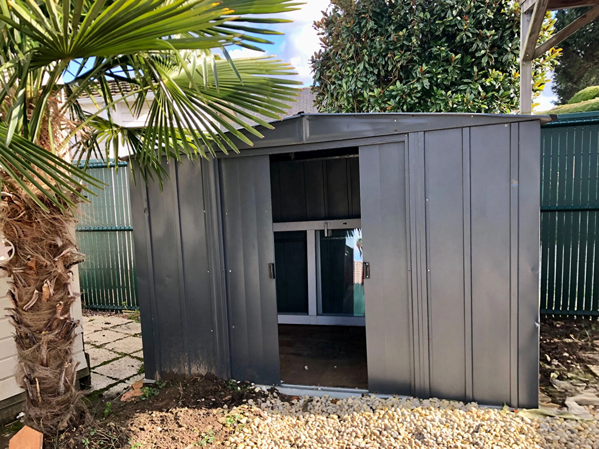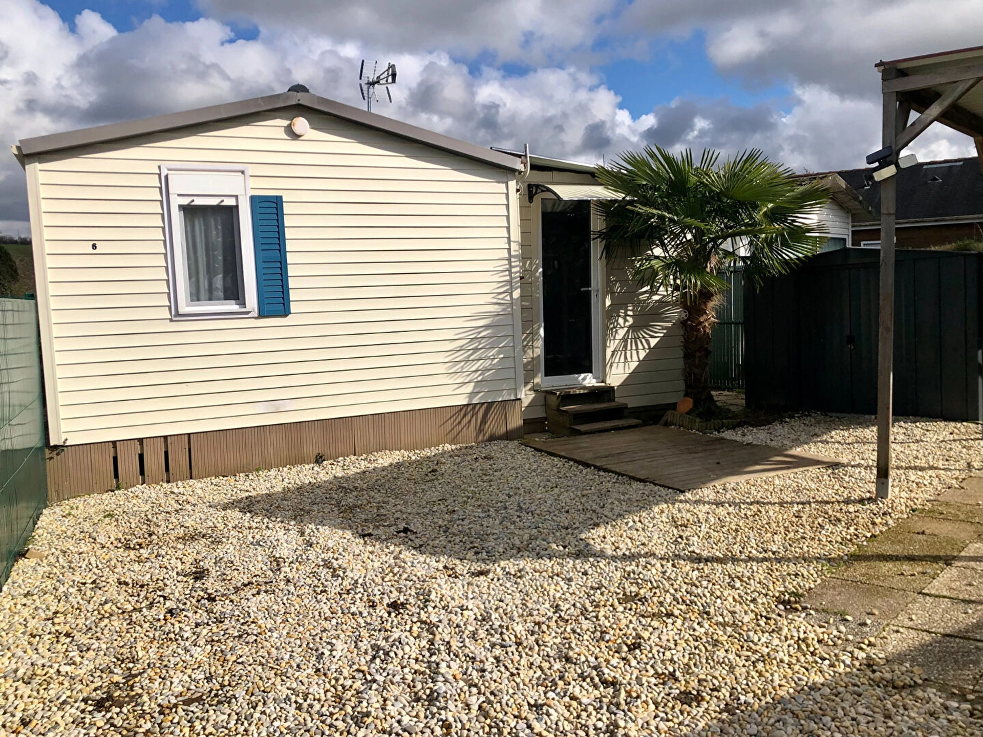 Un abri de jardin accompagne également le mobil-home.