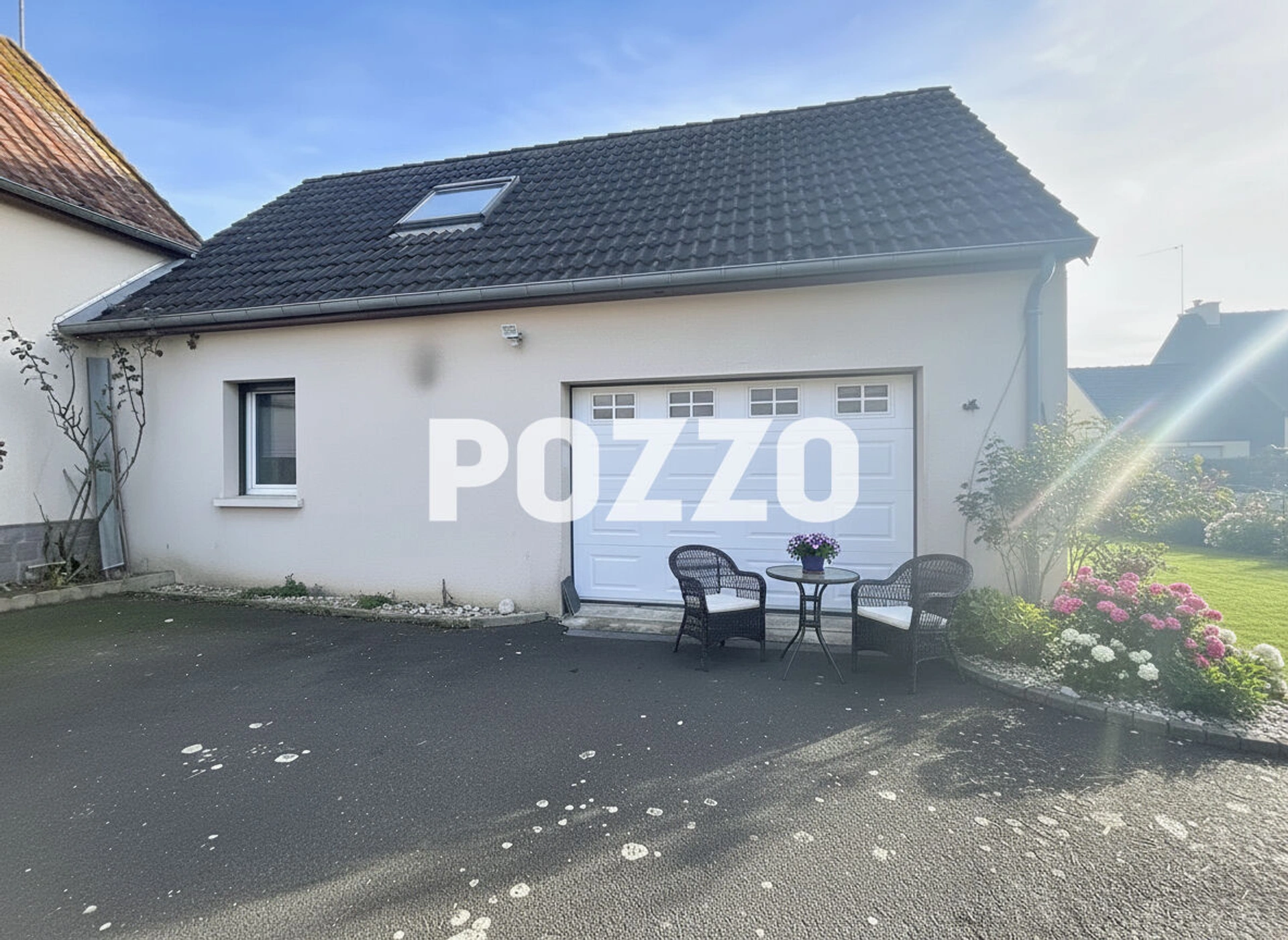 A l'extérieur, vous profiterez d'un garage de 45 m² sur dalle béton, équipé d'une porte sectionnelle motorisée, d'une cour, d'un jardin et d'une pelouse, le tout sur un terrain clos de 783 m².