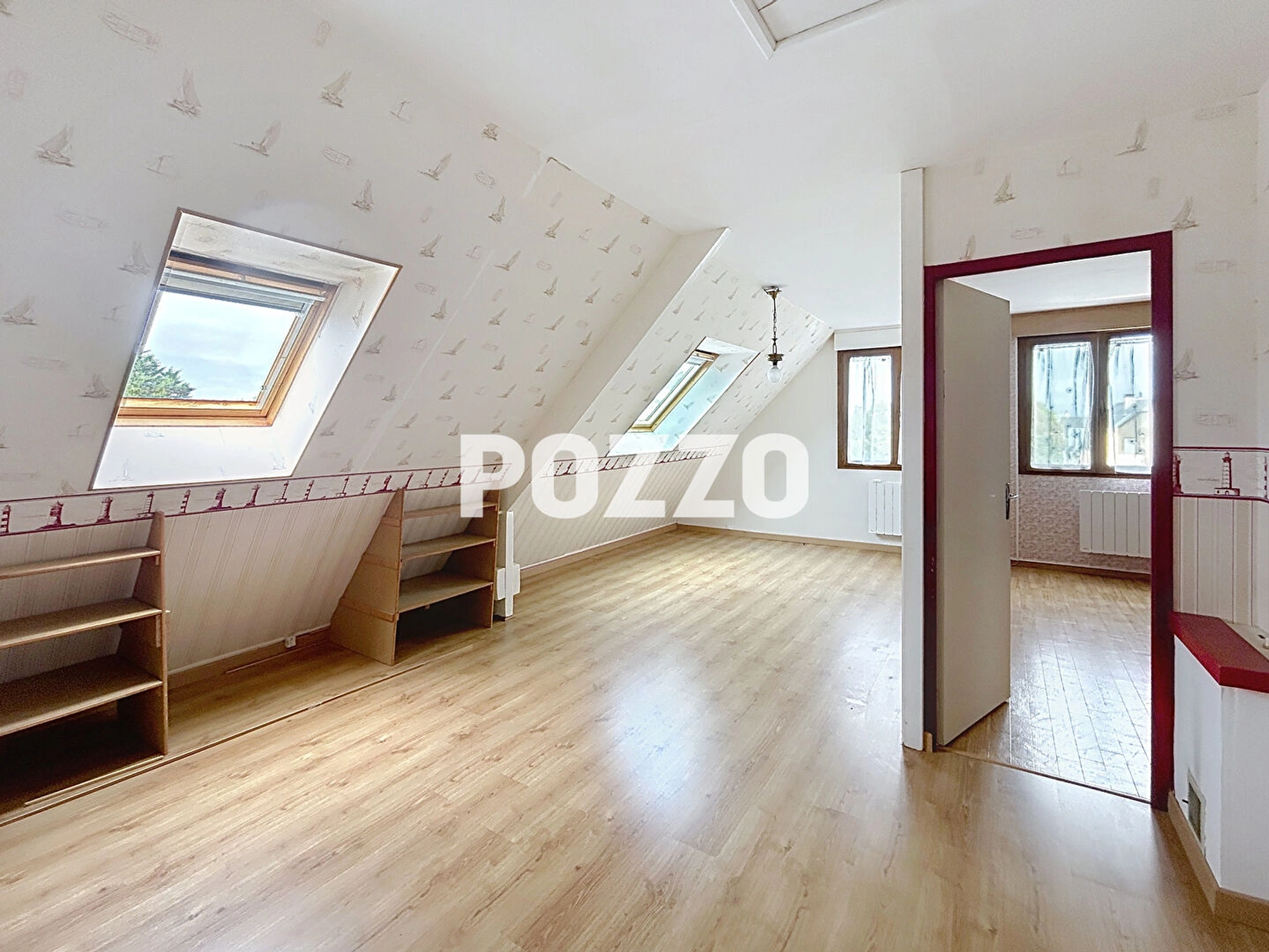 A l'étage, une grande mezzanine offre un bel espace ouvert, idéal pour un bureau ou une salle de jeux, complétée par trois chambres, une salle de bains et des WC séparés.