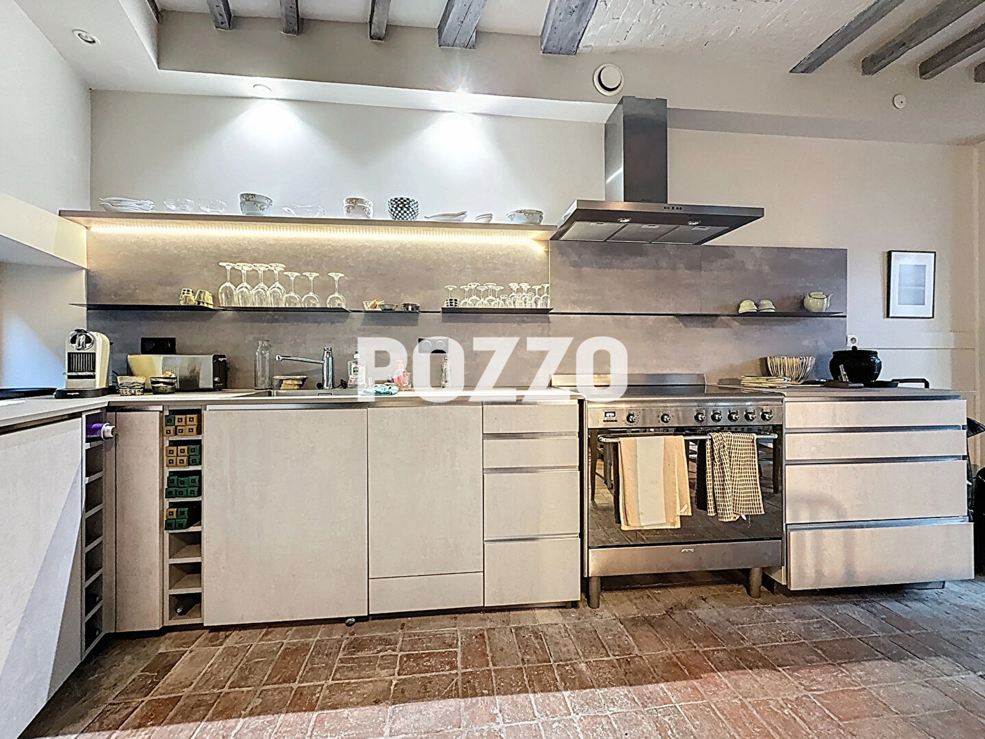 Dès le rez-de-chaussée, la maison dévoile une belle pièce de vie où le charme de l'ancien s'exprime pleinement à travers des poutres apparentes, un escalier de caractère et de superbes tomettes. La cuisine, aménagée et entièrement équipée, s'intègre avec élégance à cet espace convivial, idéal pour recevoir.