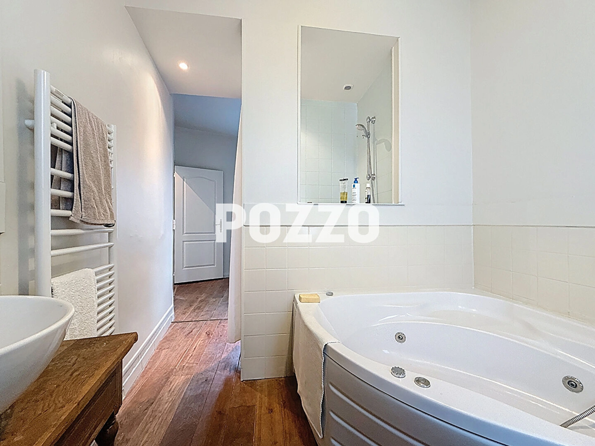 A l'étage, un palier dessert une chambre, un espace buanderie pouvant également faire office de bureau, ainsi qu'une salle de bains équipée à la fois d'une douche et d'une baignoire, avec WC.
