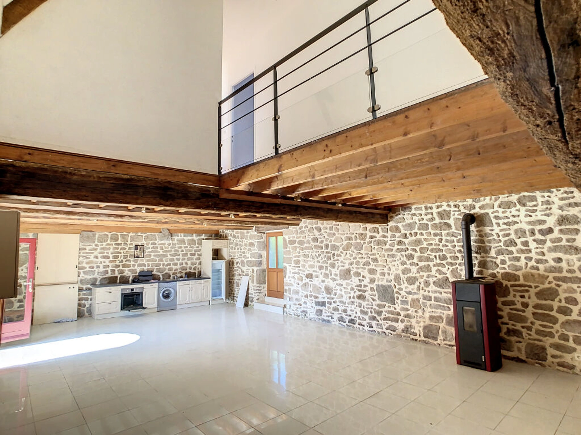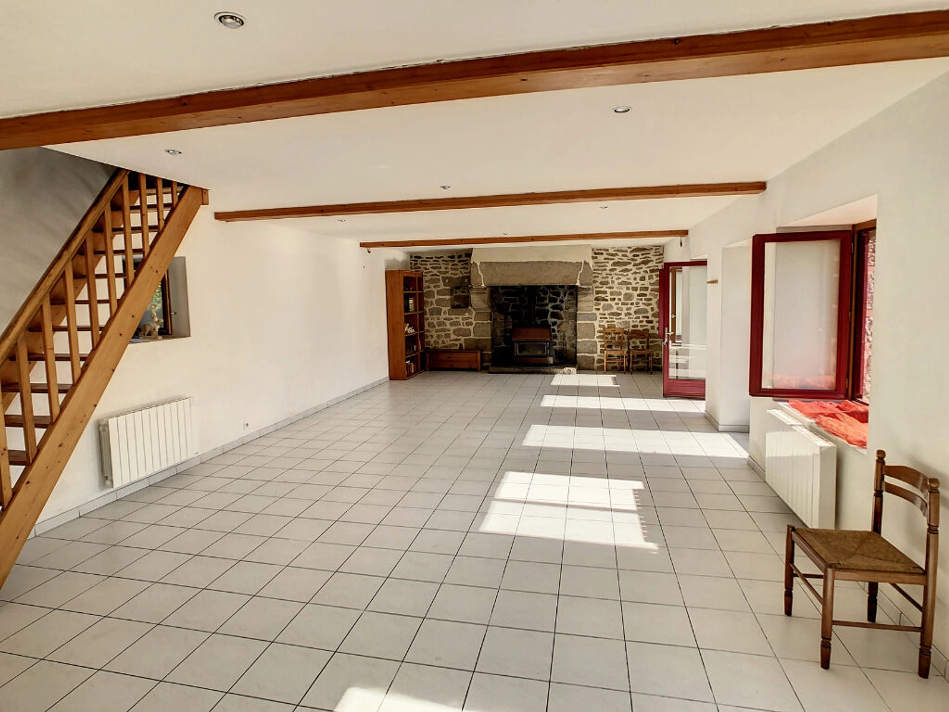 1) Une longère en pierres de 130m², composée de : - au rez de chaussée : une pièce de vie avec grande cheminée pierres avec poêle, coin-cuisine aménagée, arrière-cuisine, WC - à l'étage : trois chambres, salle de bains avec WC .