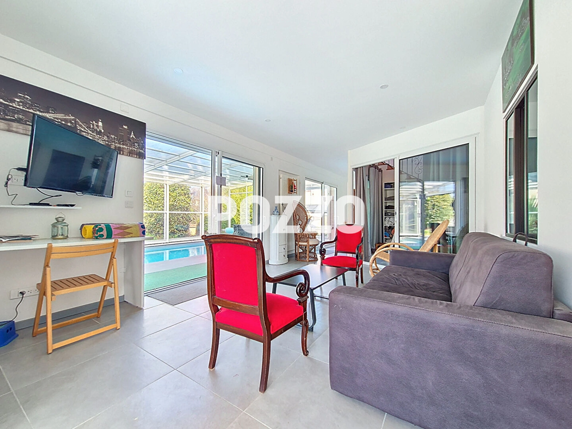 Au rez-de-jardin : un séjour avec poêle et accès direct à la piscine, une cuisine et une troisième chambre avec salle d'eau et W.C. attenants viennent compléter cet espace.