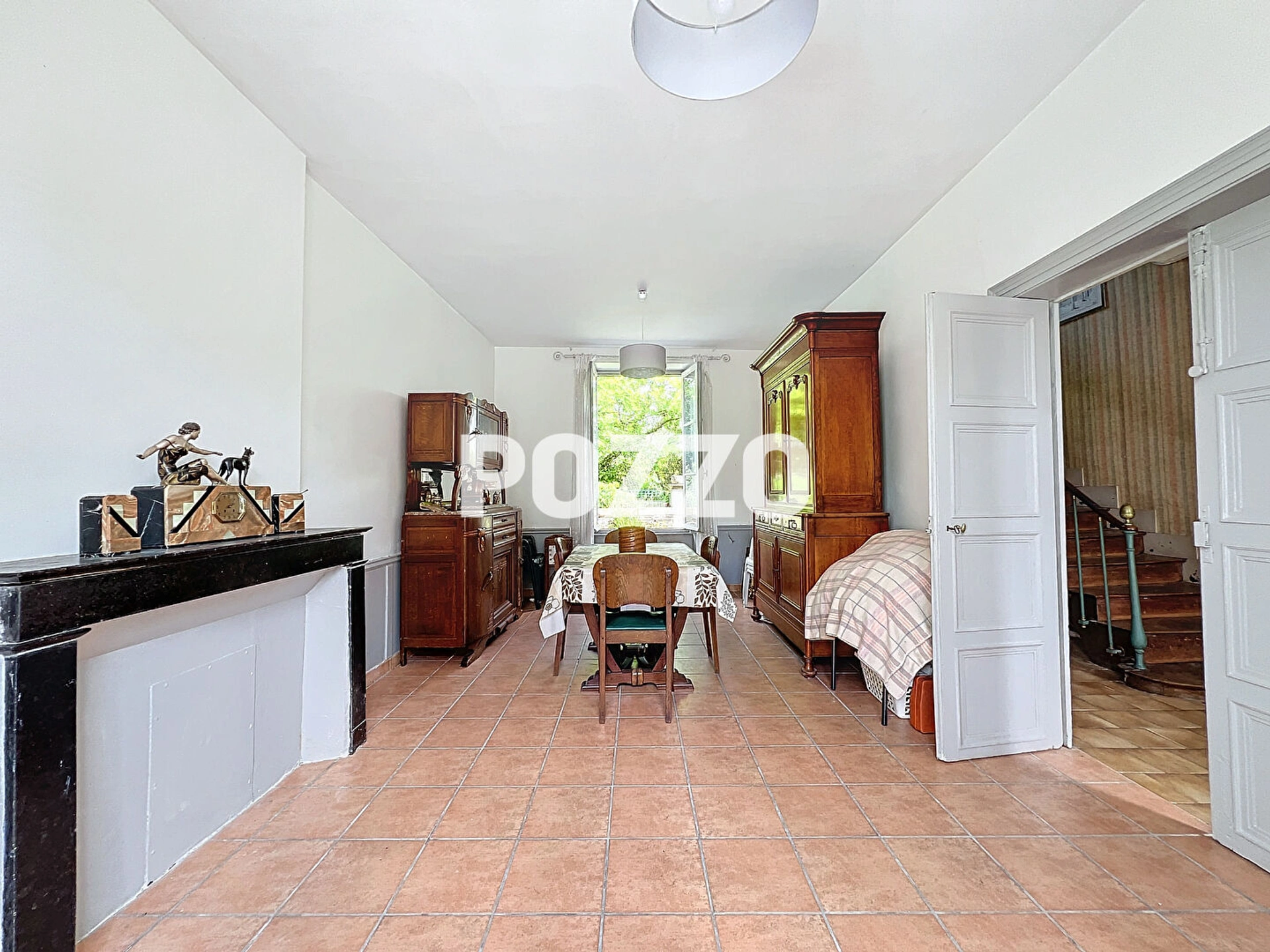 - au rez-de-chaussée vous trouverez une entrée avec un escalier tournant en chêne, un séjour traversant avec foyer ouvert, une chambre exposé côté jardin avec une salle d'eau et W.C, ainsi qu'une pièce.