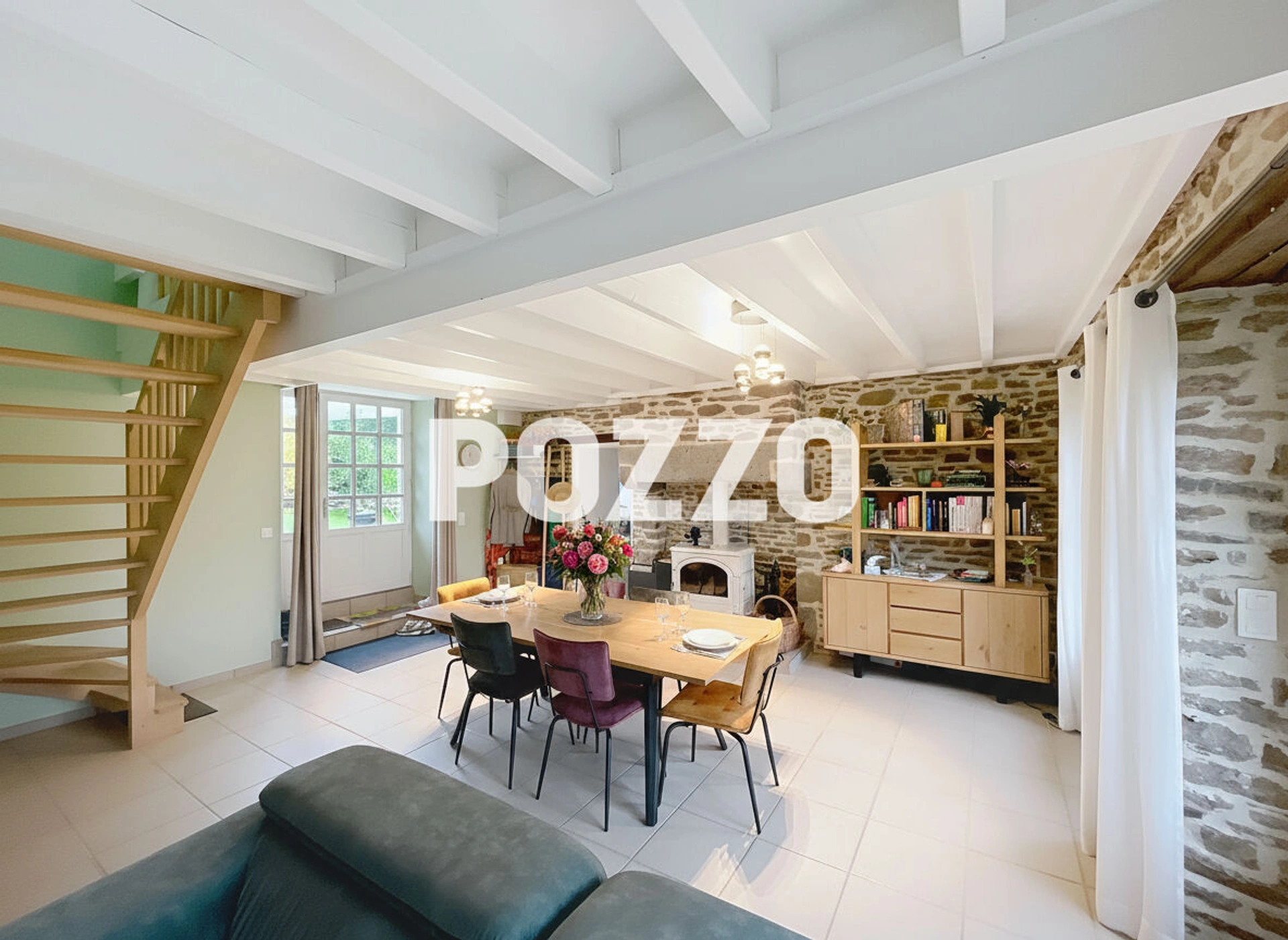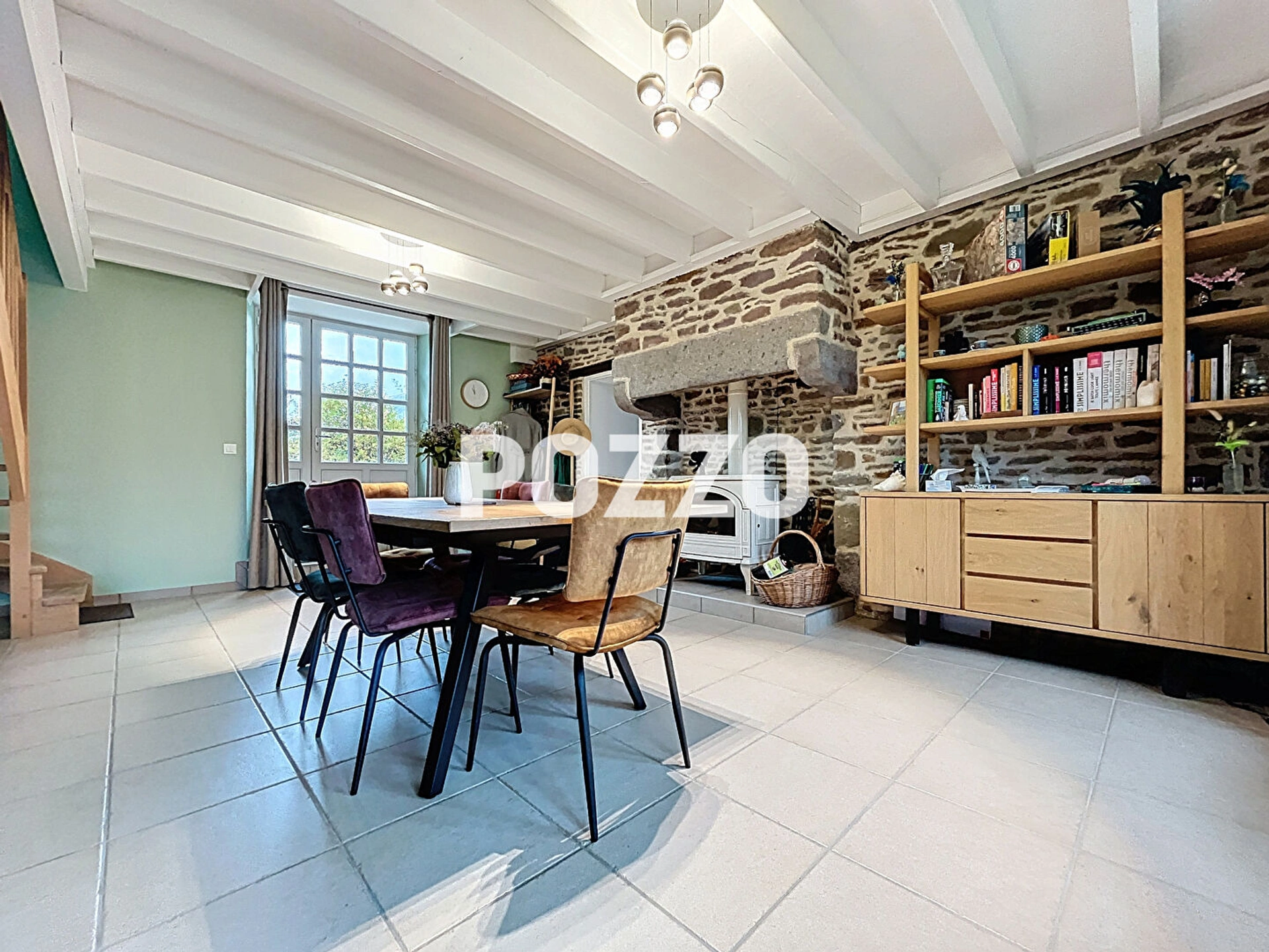 Au rez-de-chaussée : une cuisine aménagée et entièrement équipée, un séjour-salon lumineux avec poêle à bois, idéal pour des moments conviviaux, ainsi qu'une salle d'eau avec WC et coin buanderie.
