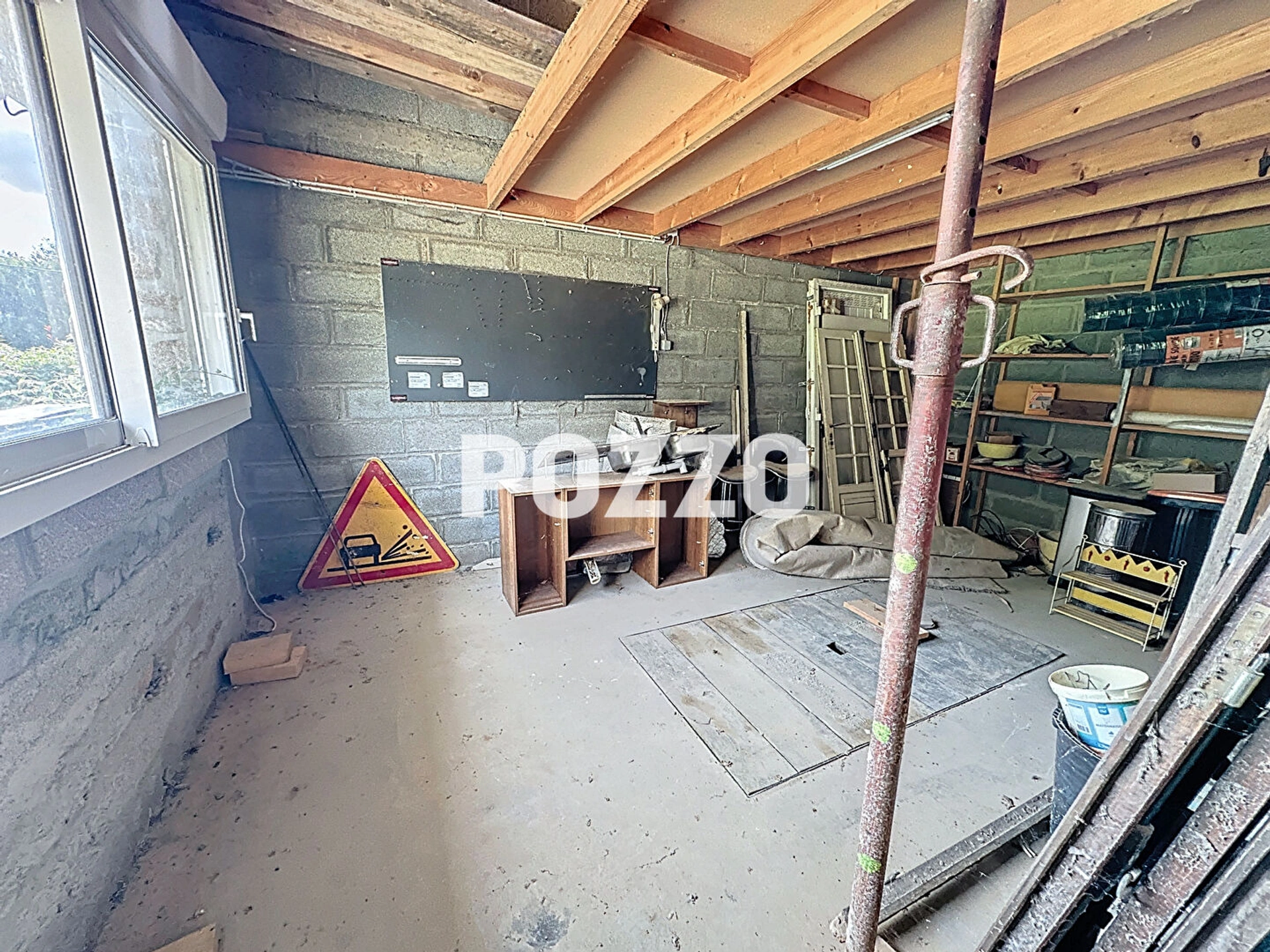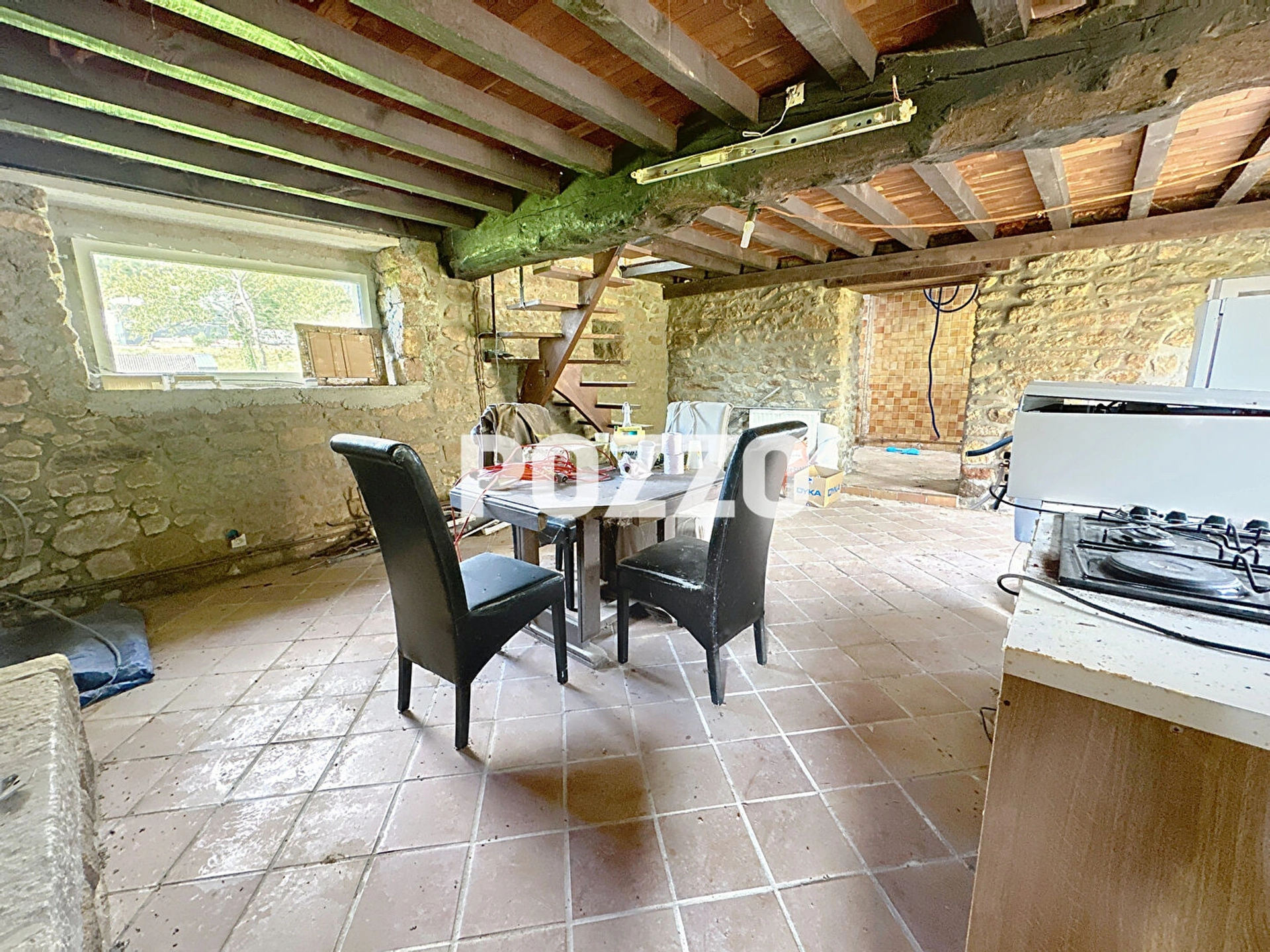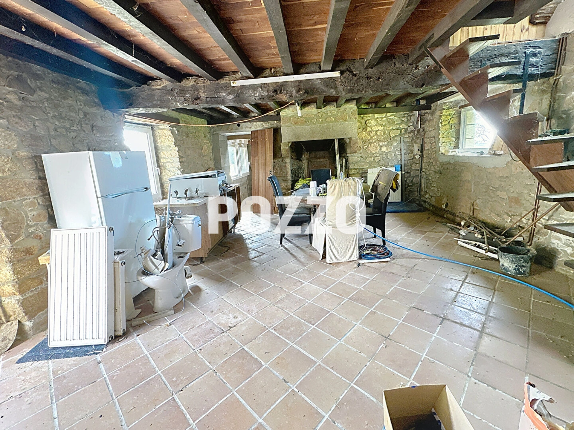 - au rez de chaussée : séjour et cheminée, espace pour cuisine et/ou salle de bains, une pièce/chambre avec mezzanine