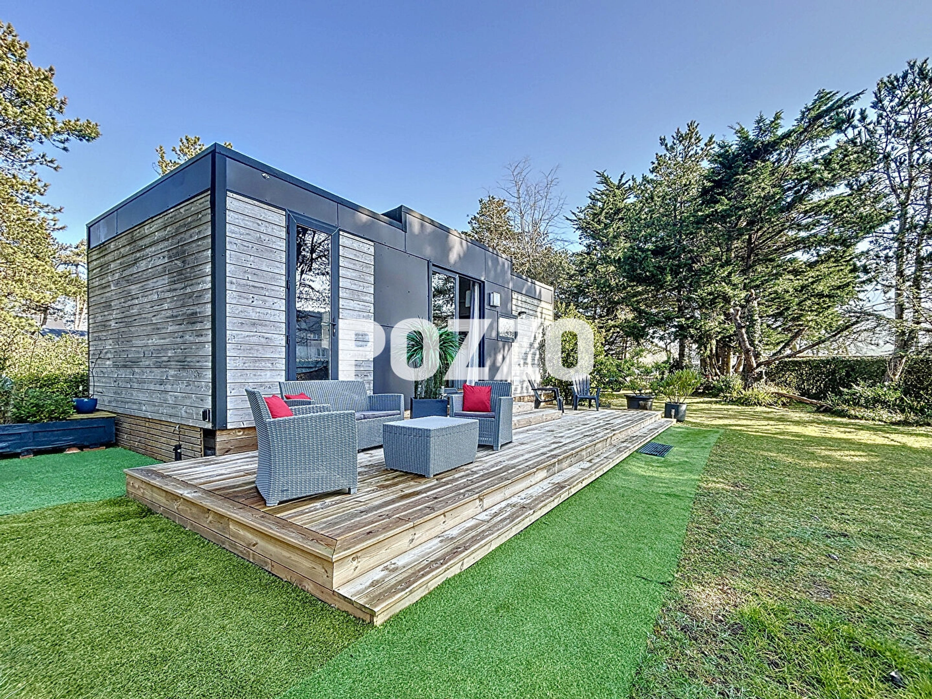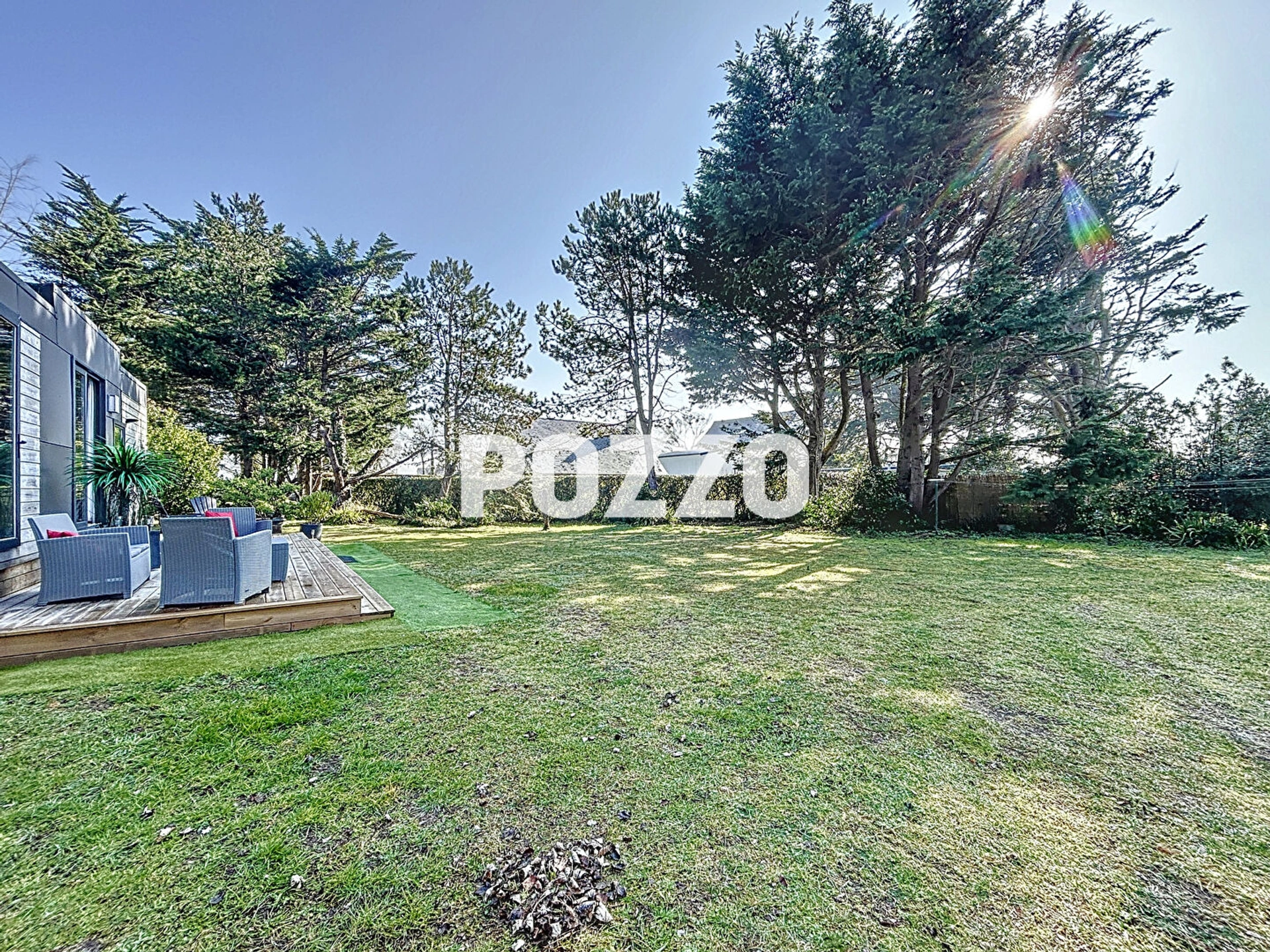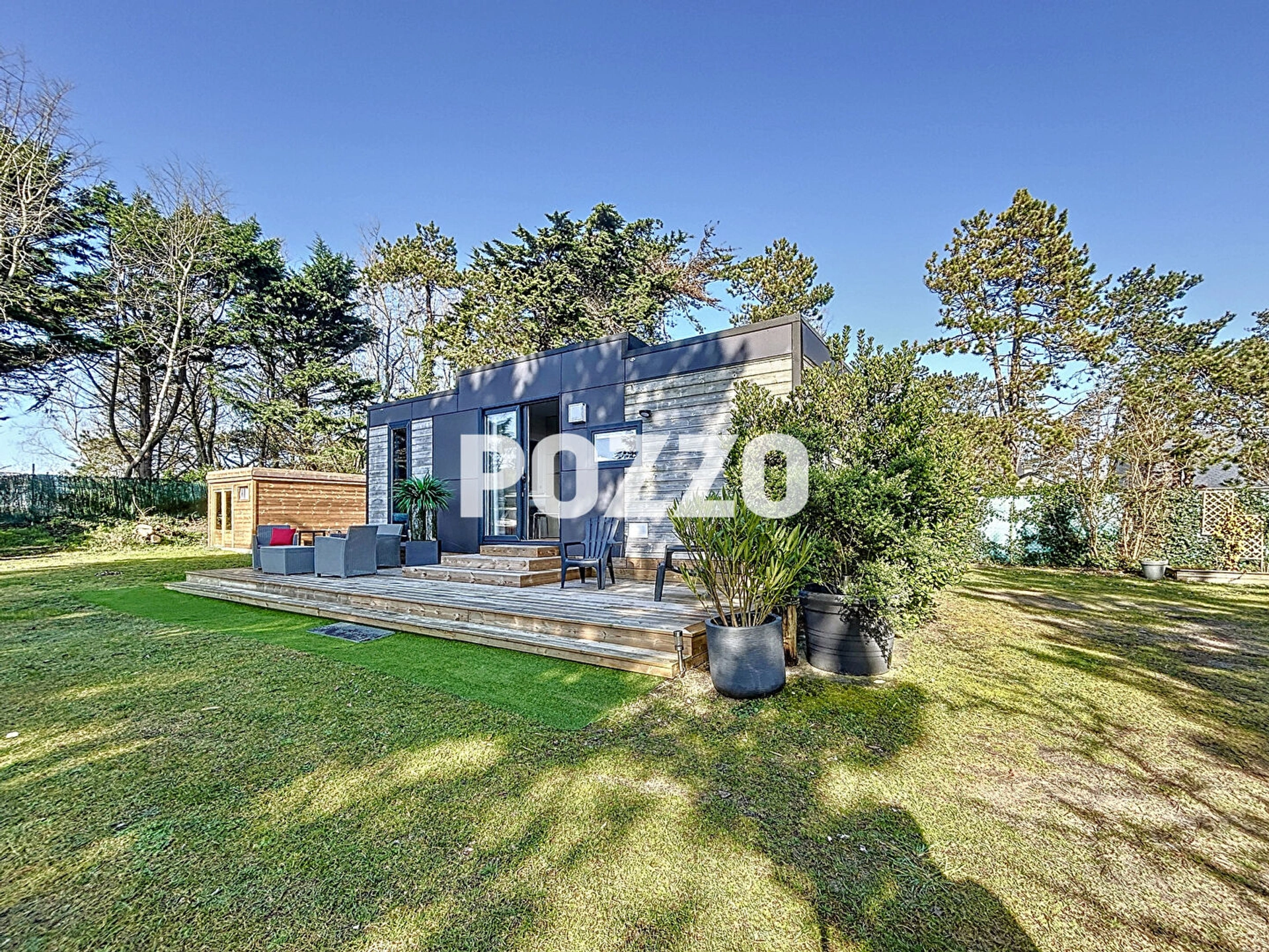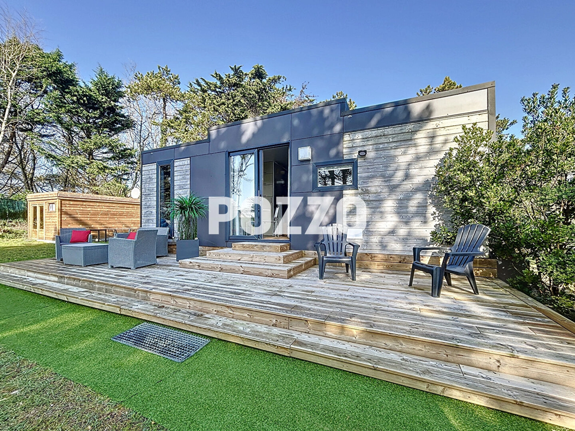 Une jolie terrasse en bois permet de profiter du soleil grâce à son exposition plein sud.