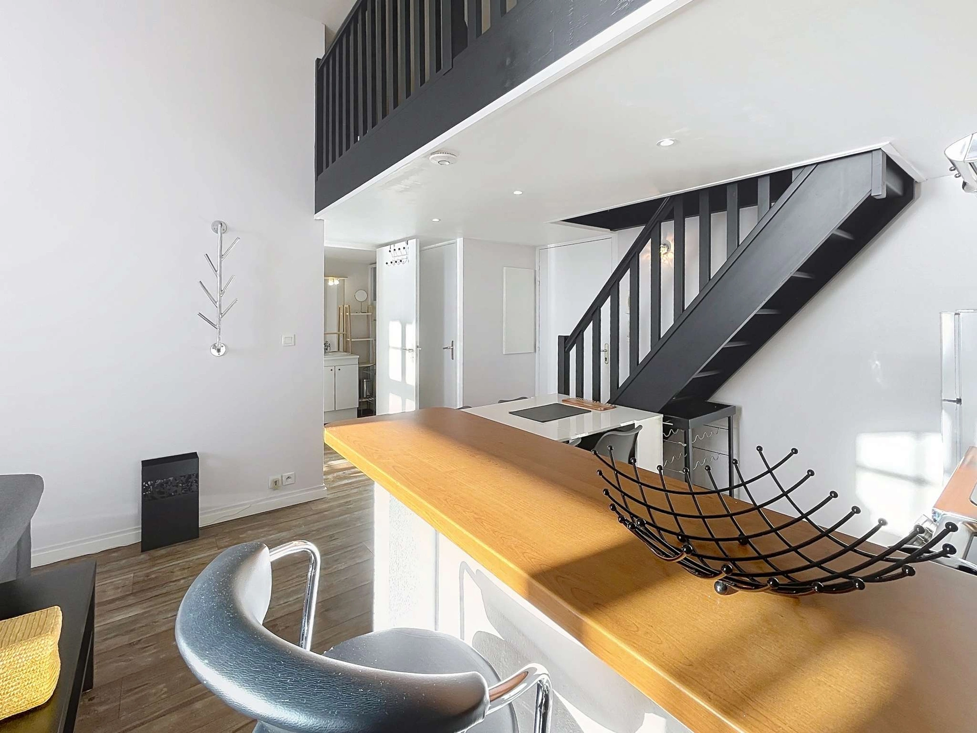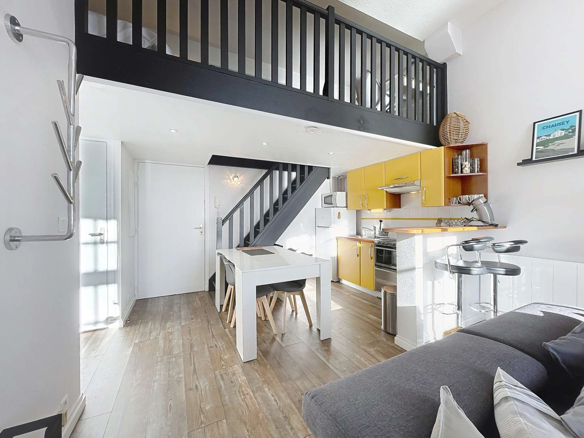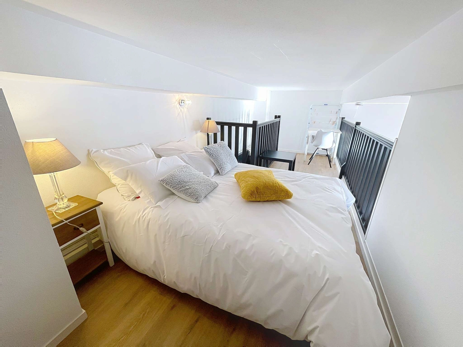 La chambre principale, équipée d’un grand lit King Size (160 x 190 cm), la mezzanine mansardée (hauteur sous plafond 167 cm) 7 avec son lit double (140 x 160 cm).La salle de bain dispose d’une douche, d’un sèche-serviettes et d’un lave-linge, les toilettes sont séparées.