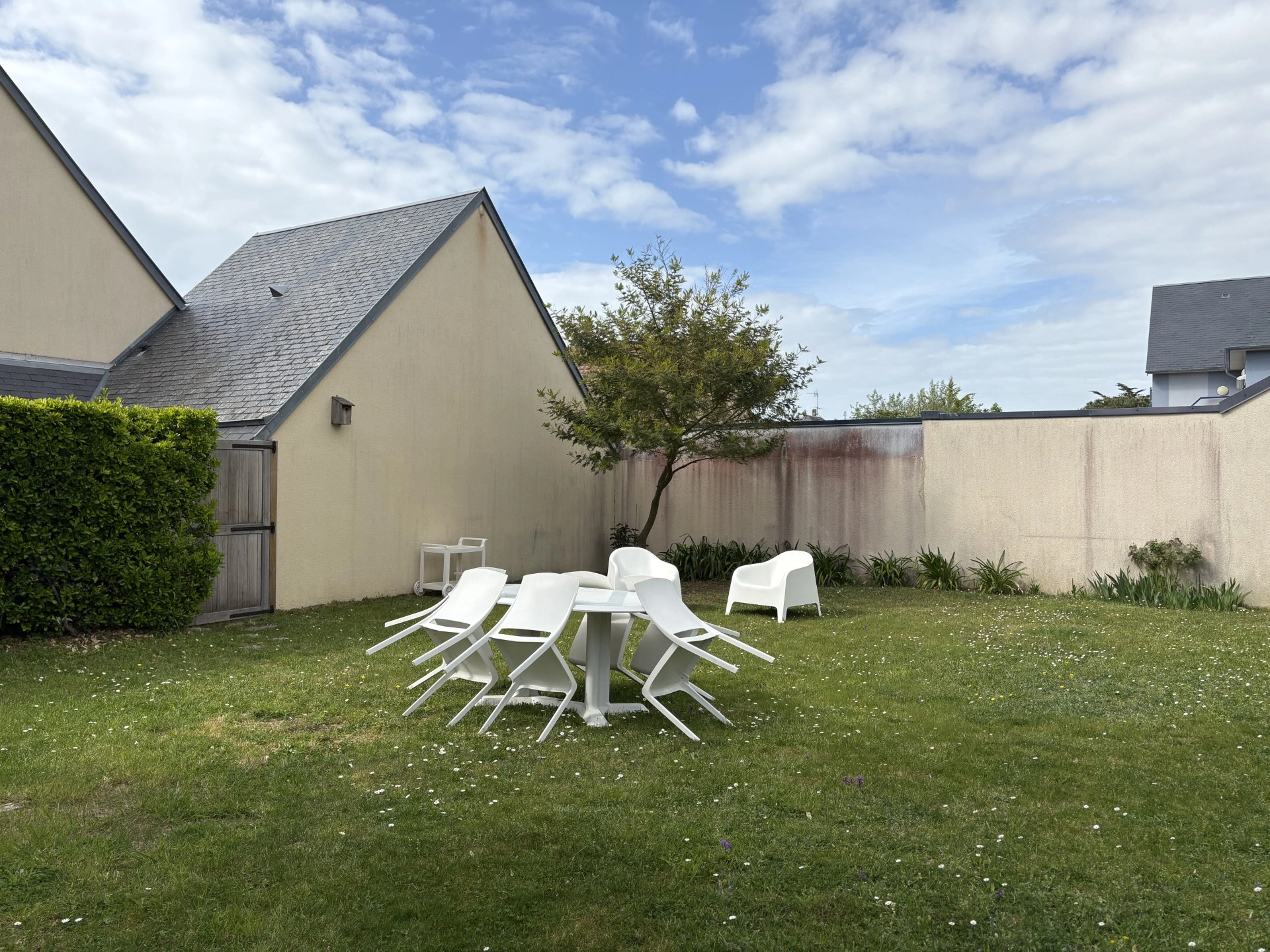 À 200m de la plage et moins d'un 1km du bourg et des commerces de Jullouville, jolie maison comprenant un salon, un coin repas et coin cuisine (four, plaques vitrocéramique, micro-ondes, lave-vaisselle, réfrigérateur/case congélateur, lave-linge et sèche-linge) donnant sur un agréable jardin. Au 1er étage, une chambre avec un lit de 140, une chambre avec deux lits de 90, une salle d'eau (douche, lavabo) et toilettes. Au 2e étage, une mezzanine avec un bureau et une chambre avec deux lits de 90 rapprochés. Jardin avec salon de jardin et barbecue.