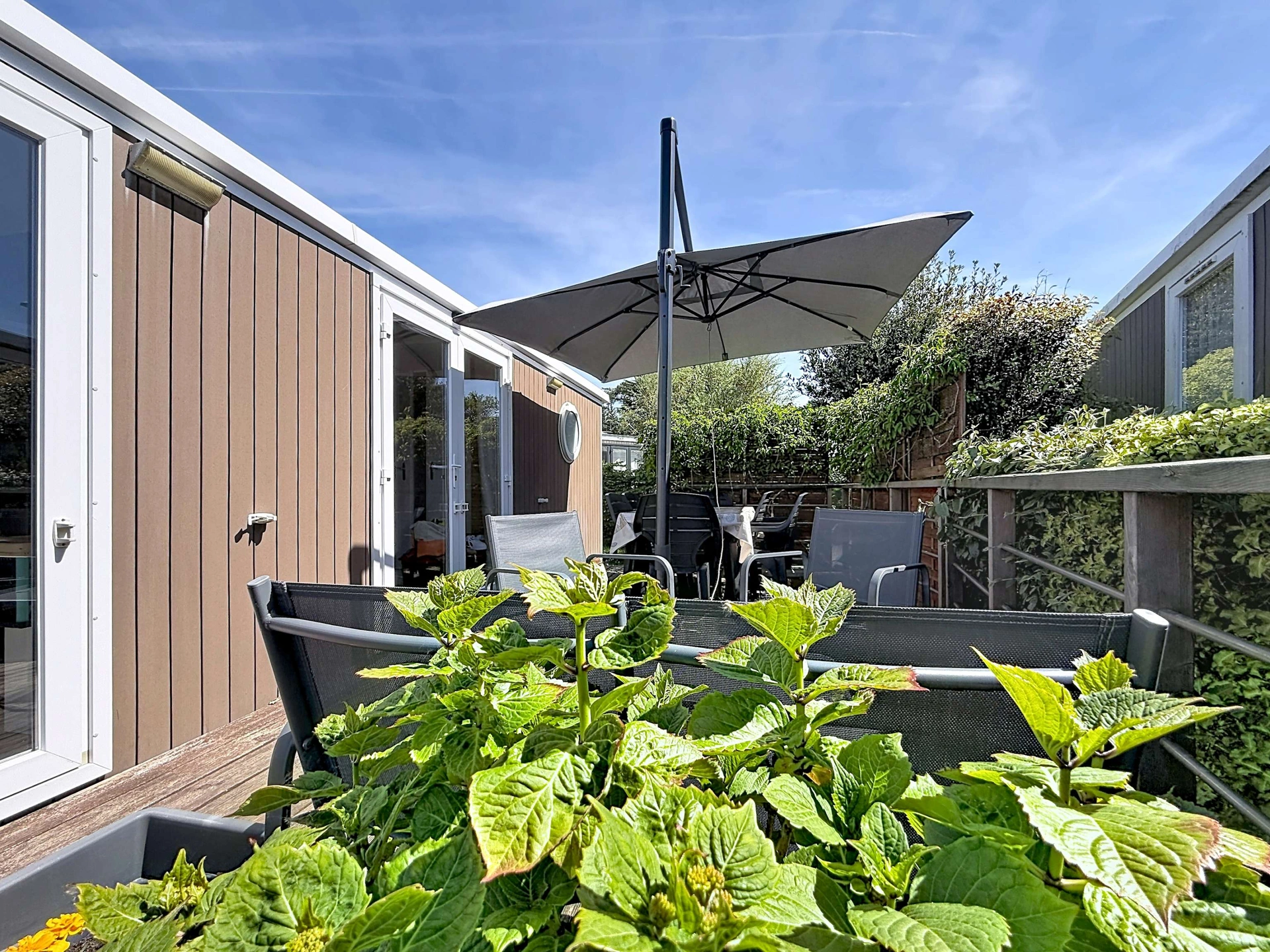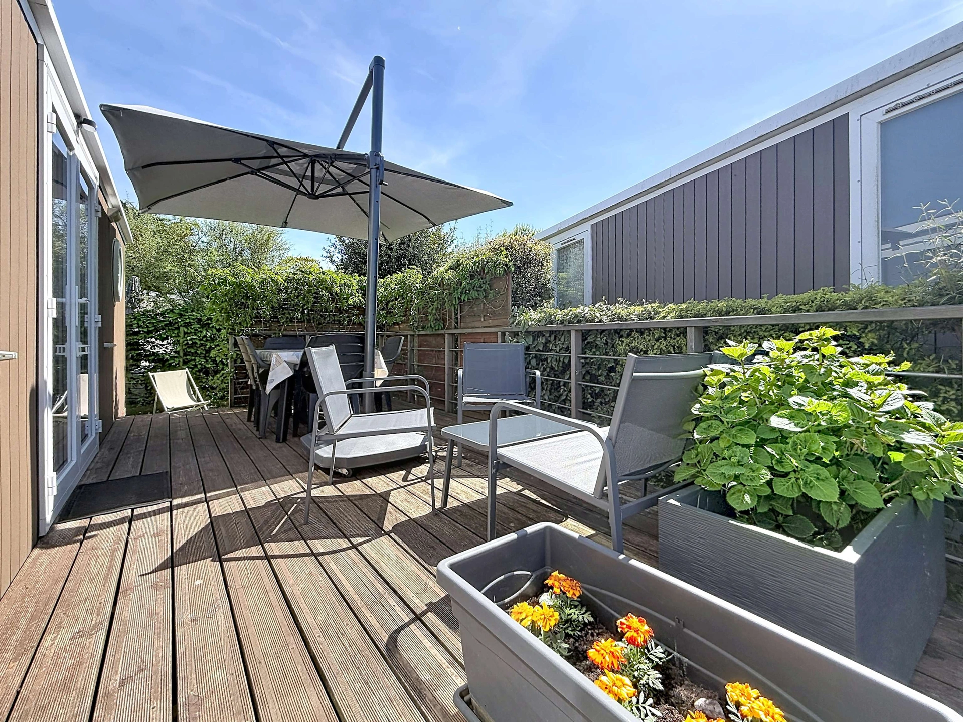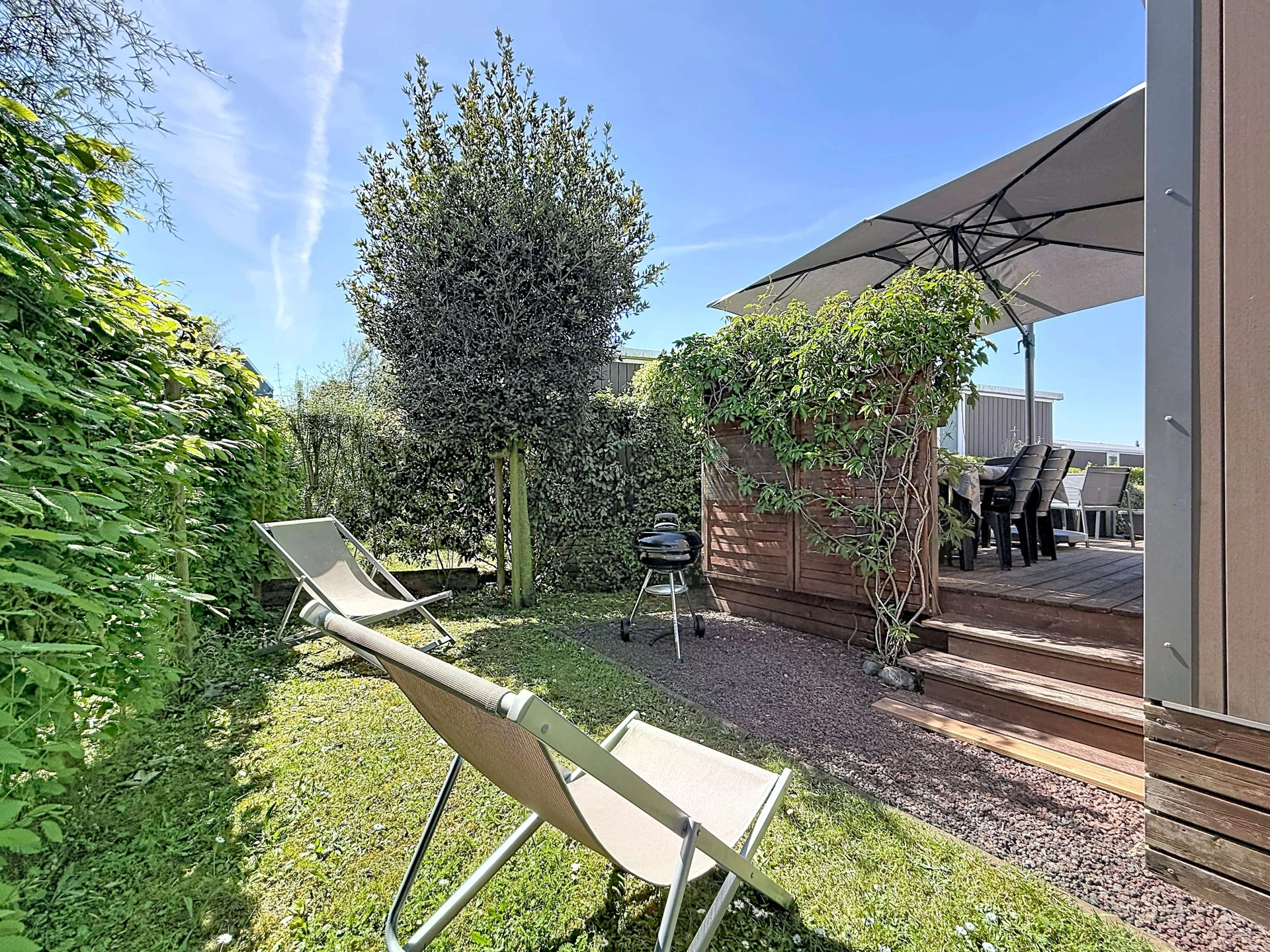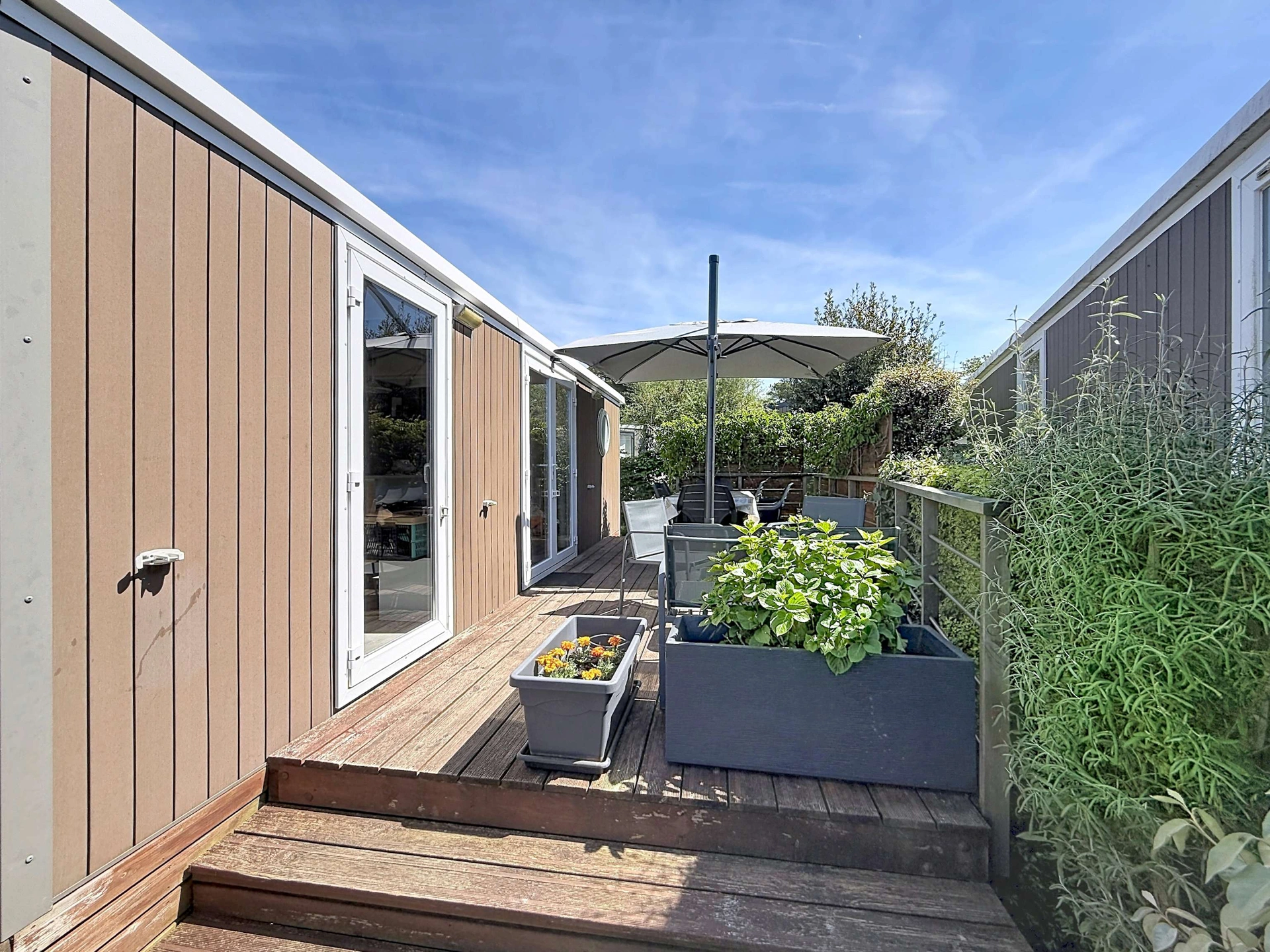 Vous pourrez profiter de la terrasse en bois équipée avec le salon de jardin, transats et d'un parasol. Un emplacement de parking est disponible sur la parcelle, uniquement pour un seul véhicule.