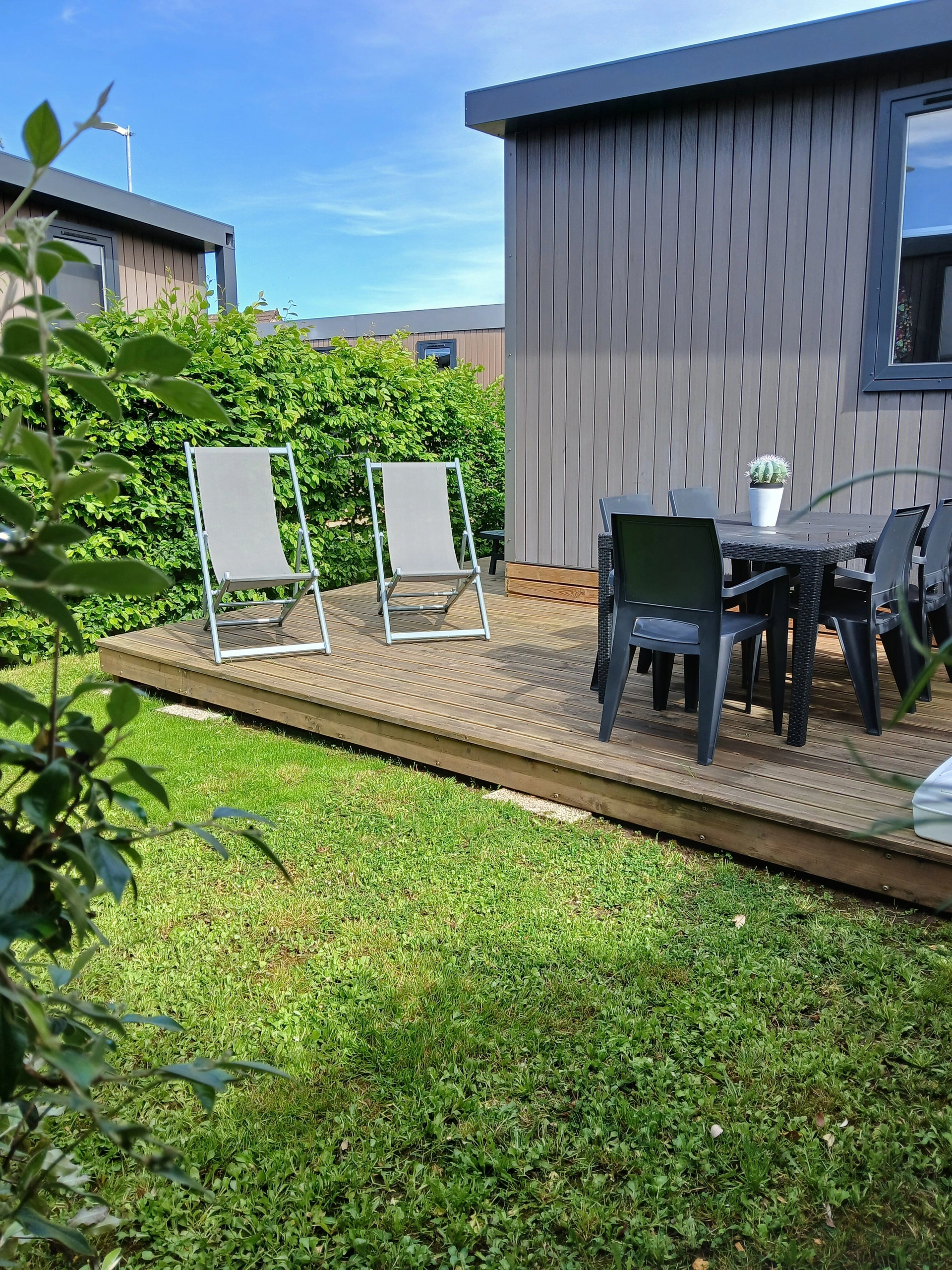 Vous pourrez également profiter de la terrasse en bois avec son salon de jardin et ses transats.